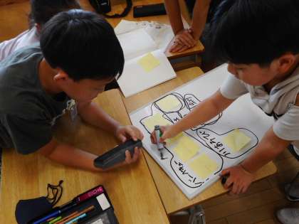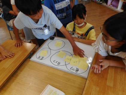 国語では、「山小屋で三日間過ごすなら何を持っていくか」についてグループで話し合いあっています。全員が納得できるように、相手の考えや気持ちを認め合いながら、話し合う姿が見られました。