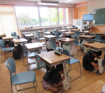 地震が発生した音を聞いて、素早く机の下に入り、身体を守る行動を取ることができました。その後、各学級で振り返りもしました。