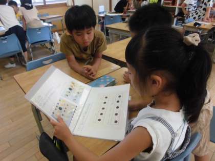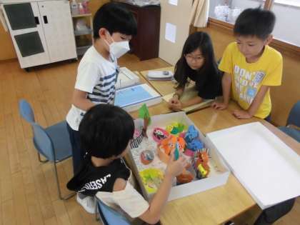 夏休みの自由研究を友達と見合いました。友達の作品を興味深そうに見ていました。