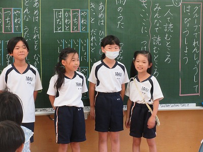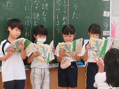 国語の学習で「雨のうた」の詩をグループで音読しました。みんなで読んだり、一人で読んだり、自分たちで考えた詩を付け加えたりして、工夫しました。
