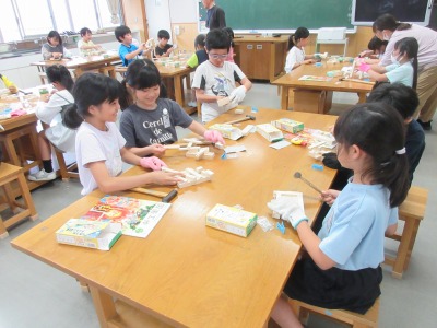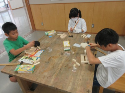 図工の学習「くぎうちトントン」の様子です。金槌にも慣れ、それぞれの作品が出来上がってきました。
