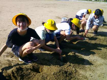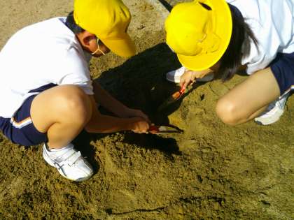 理科「大地のつくり」の学習で、地面の下がどのようになっているのか、実際にグラウンドを掘って確かめました。「しま模様になっている!」「下の方にいくと粘土みたいな土が出てきた」「オレンジ、黒、焦げ茶、といろいろな色の土が重なっている」等、たくさんの気付きがありました。