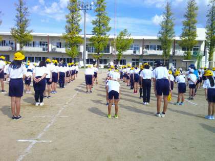 運動会の全体練習が始まりました。運動会までいよいよ一週間です。横にいる2年生や1年生のお手本になろうと一生懸命に練習に参加する姿がとても頼もしく見えました。