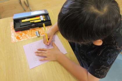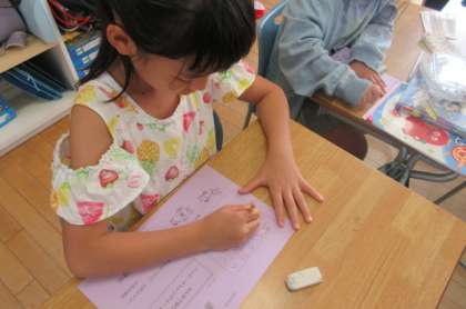 おうちの方に渡すプログラムにメッセージを書きました。「玉入れでたくさん玉を入れられるように頑張ります。」「楽しみにしていてください。」等と、丁寧に書いていました。