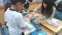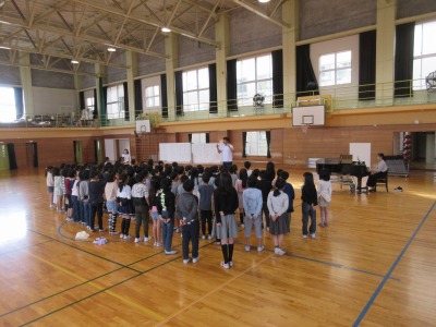 ステージでの並びで体育館で練習しました。楽器や朗読も入れて、曲を通して歌いました。