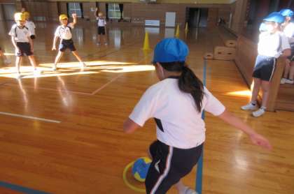 ボールの蹴り方や守備の工夫等を考えながらゲームに取り組んでいます。仲間と作戦を考えたり声をかけ合ったりしながら、全力プレーを目指して頑張っています。