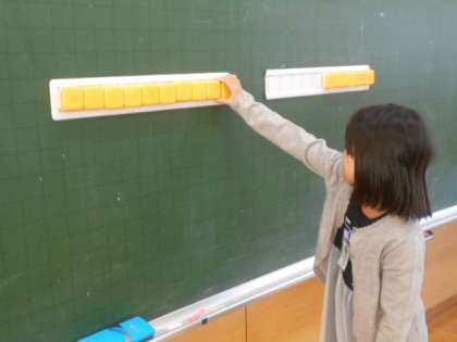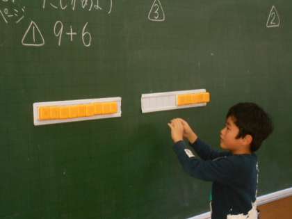算数科では、くり上がりのある足し算を学習しています。ブロックの操作をしたりノートに計算を書いたりして、友達と説明し合っています。計算カードの練習もがんばっています。