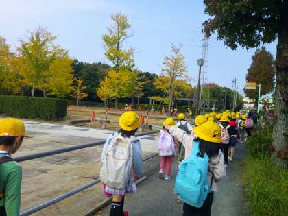 きれいに色づく木々の葉を見て、秋見つけへの気持ちを膨らます子供たちです。