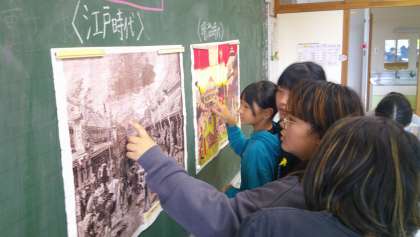 社会科「明治の国づくりを進めた人々」の学習がスタートし、初めに江戸時代と明治時代を比べました。「服装も建物も洋風になっている!」「たった20年でこんなに変わったのはどうして!?」「鎖国をやめて外国と交流を始めたのではないかな」と、気付いたことや疑問に思ったこと、予想等を話し合いました。