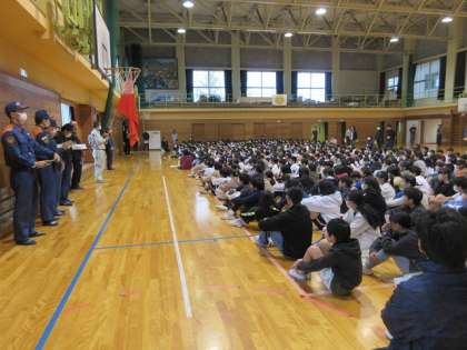 富山消防署東部出張所から所長さんを始め5名の消防士さんが来校され、避難訓練を行いました。家庭科室から出火という想定で、体育館へ避難しました。子供たちはとても真剣に避難することができました。所長さんの講評では、しっかりと避難できたと褒めていただきました。火災の際には煙から身を守ることの大切さなどを指導していただきました。教えていただいたことを守り、安全な生活を送っていきたいです。