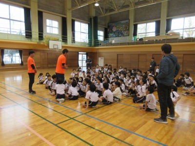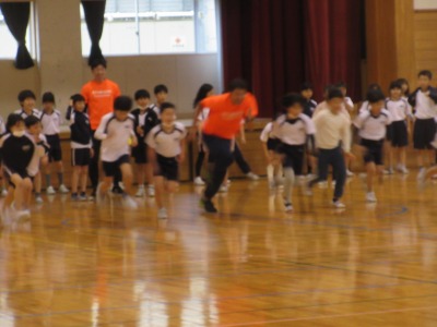 走り方教室を開き、二人の講師の先生から速く走るポイントをたくさん教えていただきました。最後には、勝負もしていただき、楽しい時間でした。