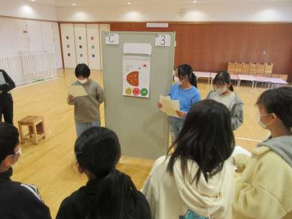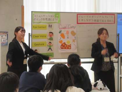 授業は6年2組の子供たちが、「グループのオリジナルカレーを、工夫しながら英語で伝え合おう」の学習課題で、画用紙に描いたカレーの説明を英語で伝え合いました。英語で上手に伝えることができました。担任と小学校外国語活動支援講師の2名が進めました。
