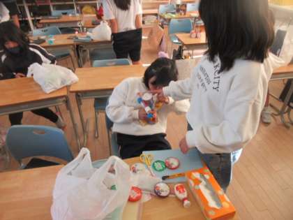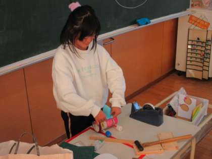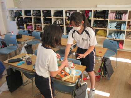 図工の学習では、風の力やゴムの力で動く車を作りました。