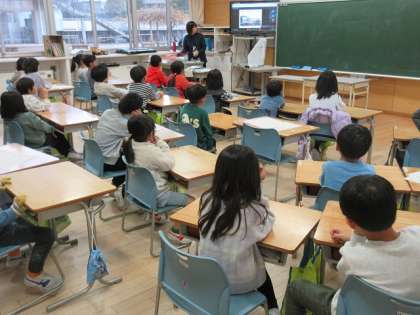 はじめに校長先生から、東部小学校の歴史を話していただきました。木造校舎から鉄筋コンクリートの校舎になり、8年前に今の校舎となったことや、全校児童数や教職員数について、クイズ形式で教えていただきました。児童数が1000人を超えていた時期もあると聞き、子供たちは驚いていました。