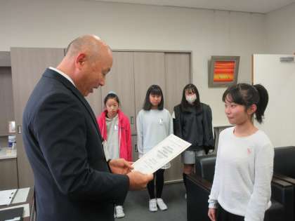 チアリーディングの世界選手権大会で2位となった2名と、富山市防火ポスターで優秀な成績を収めた2名の計4名に、校長先生から賞状が渡されました。