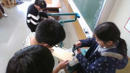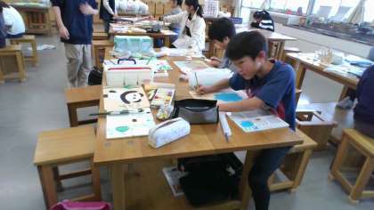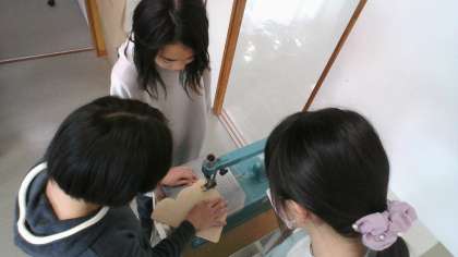 デザインしたパズルを、線に沿ってきれいに切れるように作業しています。安全に気を付けて、仲間と協力しながら電動糸鋸を使いました。