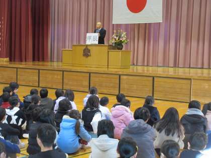 始業式では、校長先生から、今年は「甲辰(きのえたつ)」の年で「始まり」を意味するとのお話がありました。子供たちは、何事にも希望をもってスタートすることの大切さを知り張り切っている様子でした。