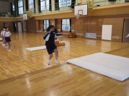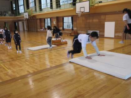 上の写真は、「かかえ込み跳び」の練習の様子です。