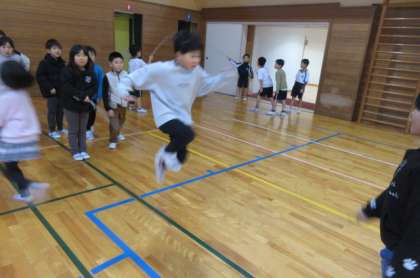 朝のパワーアップTOBUや休み時間に、大縄跳び(八の字跳び)の練習に励んでします。