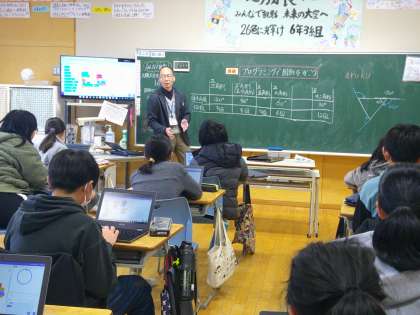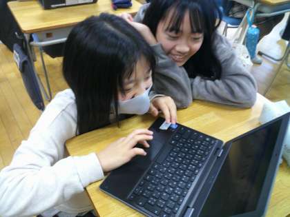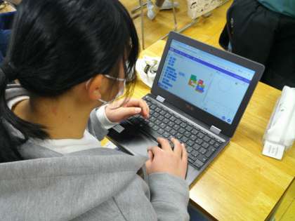 高本先生と、プログラミングの学習をしました。Scratchというソフトを使って、図形を描くプログラムをつくりました。プログラミングに慣れてくると、角度を変える指示を工夫して、長方形だけではなく、様々な多角形を描いていました。
