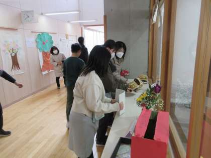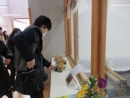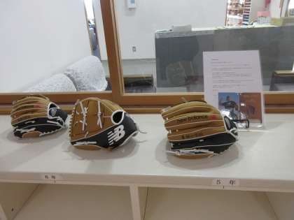 学習参観の折に、職員室前で大谷グラブを披露しました。保護者の方は足を止め、興味ありげに見たり触ったりしていました。実際にはめてみる方もおられました。