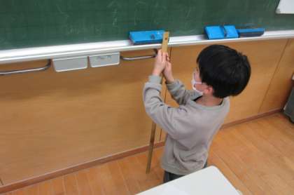 算数科の学習で、身の回りにある「大体1mぐらいのもの」を探して、ものさしで長さを測りました。