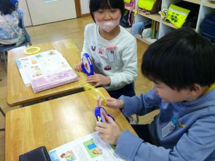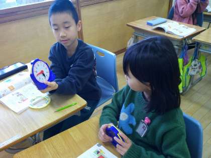 算数科で、時計の読み方を学習しています。友達と問題を出し合って、理解を深めています。