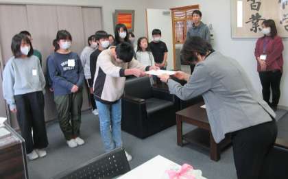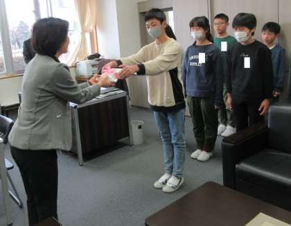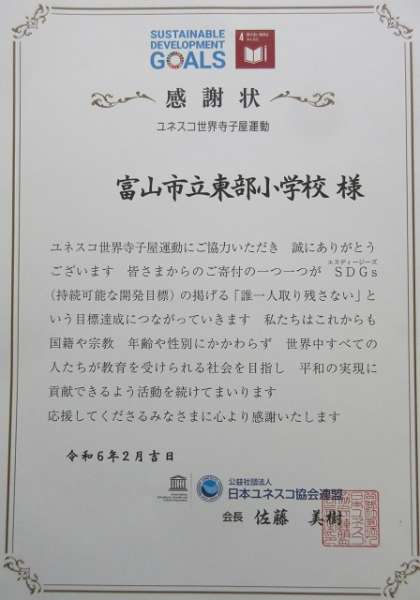 ボランティア委員会が、1月から全校児童に呼びかけて集めた「書き損じハガキ」を、本日、ボランティア委員会委員長から富山ユネスコ協会の方にお渡ししました。お返しに、日本ユネスコ協会連盟から感謝状をいただきました。