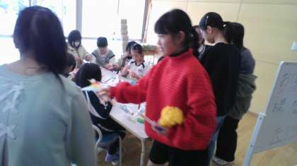 5年生の飾り係が中心となって、集会の飾りに使う輪を繋げたものを作っています。休憩時間に、1から4年生がボランティアで手伝いに来てくれています。