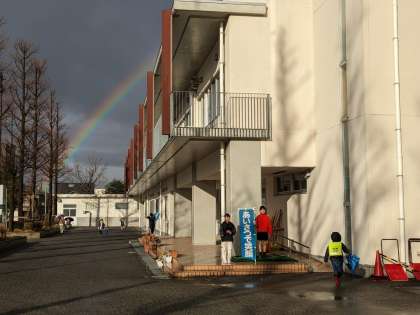 今朝、子供たちの登校時に、若草委員会の5年生があいさつ運動をしていると、空に大きな虹がかかりました。さわやかなあいさつで、お互いの心をつなぐ綺麗な虹がかかったように見えました。