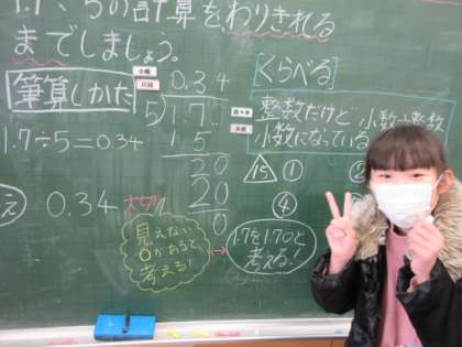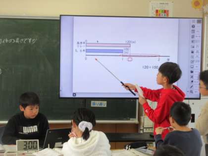 算数科の「小数のかけ算・わり算」の学習では、子供たちが先生役となって授業を進める学習を部分的に行いました。