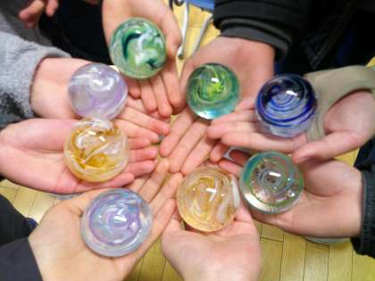 1月にガラス工房でつくったペーパーウエイトが仕上がったので、みんなで開封しました。「すごい!」「きれい!」と、箱を開けた子供たちは大喜びでした。小学校生活を思い浮かべながら、大切に使って欲しいです。