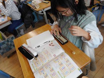 算数科では、そろばんで数を入れたり、たし算をしたりしました。最初は筆算とは違う考え方に戸惑っていましたが、どんどん慣れてきて、そろばんの便利さを感じていました。