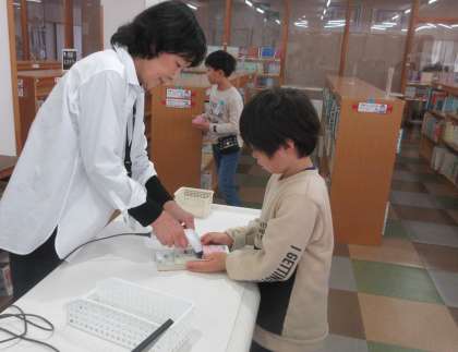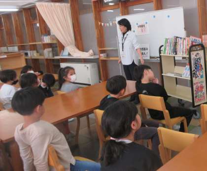学校司書の先生から貸出や図書室の使い方についての話を聞いた後、本を借りました。