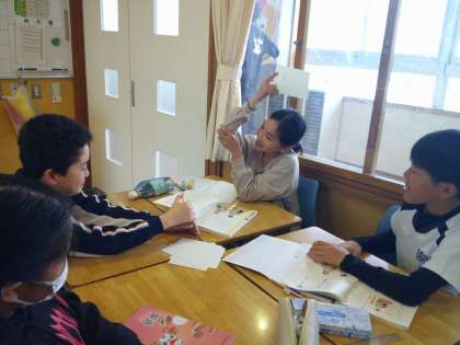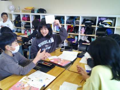 国語科の学習で、「ひみつの言葉」が書かれた紙を持った友達からその言葉を引き出そうと、話題を考えて話したり質問したりしました。子供たちは「その人が経験していそうなことを話題にしたらひみつの言葉を引き出せた!」「○○さんの質問の仕方がすてきだった」などと振り返っていました。