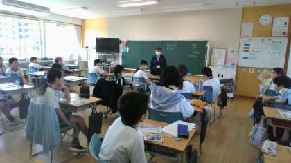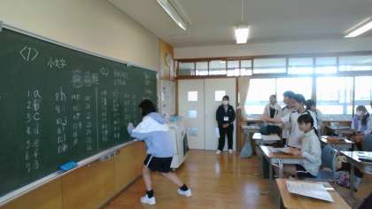 新しいALTの先生と初めての授業。教室を2チームに分けてアルファベットの早書き競争をしました。「早く早く!」「次はKだよ!」仲間にアドバイスをしながら、白熱したゲームを楽しみました。