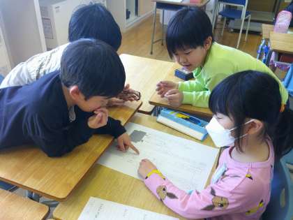 1年生さんに早く学校のことについて知ってほしいと、学校紹介の準備をしています。校内の地図を見て、紹介したい場所を決めました。
