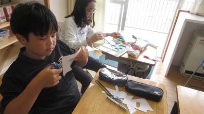 学級目標の模造紙に貼る、一人一人の人形を画用紙でつくりました。思いを込めて水彩で丁寧に描く子、自分の似顔絵を描いて描く子等、様々な人形ができあがりました。
