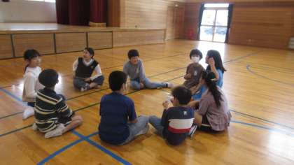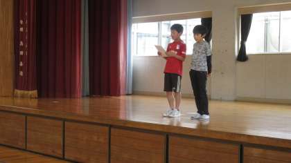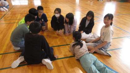 「『楽しむ』をかたちに 学年の仲を深めよう」という目当てを立て、学年集会をしました。今回は、6年1組が集会の運営を担当しました。司会進行や始め・終わりの言葉、プログラムやゲーム、BGMなどの役割を担当し、学年のみんなを楽しませようと考えた内容を実行しました。最初のゲームは人狼ゲームです。3クラス合同で7チームに分かれて、人狼ゲームを楽しみました。どのグループでも推理や話合いが活発に行われ、学年の仲が深まったようです。