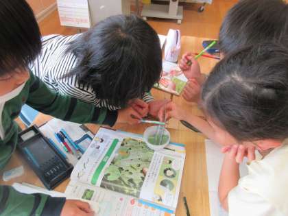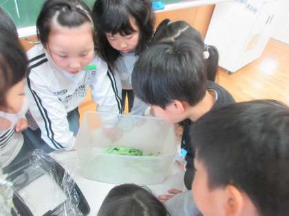 モンシロチョウの幼虫を観察して、色、形、大きさ、動き方等を調べました。