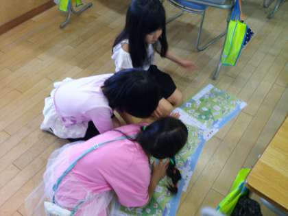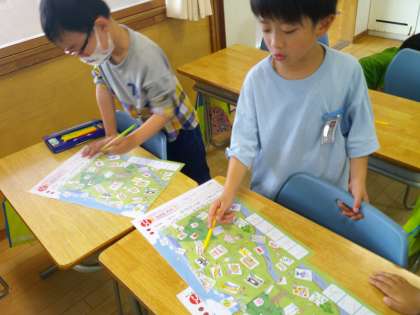 プリントの絵からいろいろなものを見つけて、友達と伝え合いました。友達と話すことでいろいろな発見ができ、とても楽しかったようです。その後のひらがなの練習も丁寧に取り組みました。