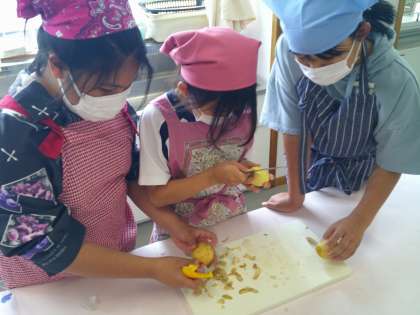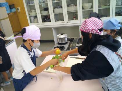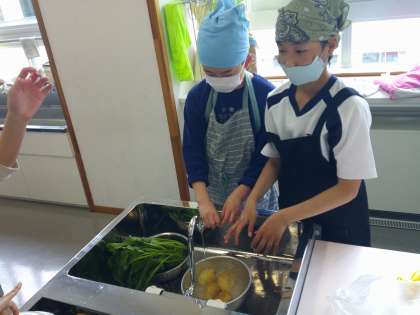 家庭科の学習で、「ほうれん草のおひたし」と「ゆでいも」をつくり、手順を確かめながら進めました。野菜をゆでている間に片付けをしたり、進んで友達を助けたりするなど、協力して活動する子供たちの姿が、とても素敵でした。