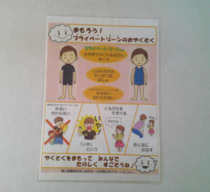 富山県警察本部の少年サポートセンターの方に、「くもくん教室」を実施していただきました。「プライベートゾーン」は、自分の大切なところで、他の人に見せたり触らせたりしてはいけないこと、どのように行動したらよいかについて学びました。子供たちは、復習のクイズでしっかり確かめました。