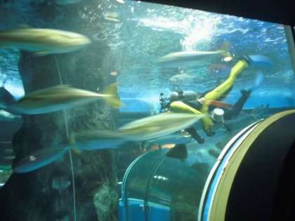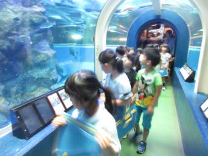 子どもたちは、トンネルの中で魚が泳ぐ様子をよく見ていました。ダイバーさんが手を振ってくれました。