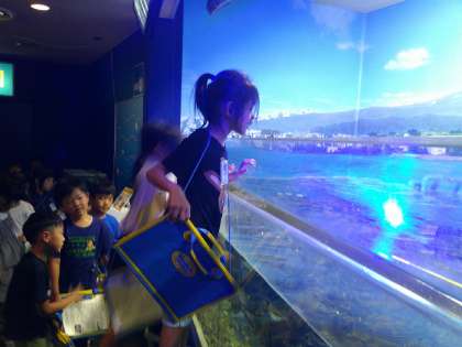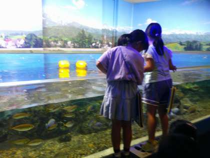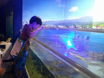水槽の上からのぞいて見ています。興味津々の子どもたちです。