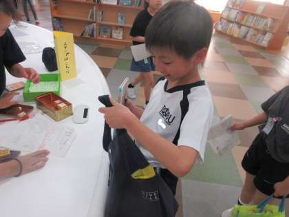 図書委員会が作った「図書室ポイントカード」を持って、図書室を利用している子供たち。スタンプが貯まると「プラス1冊貸出券」やしおり等のプレゼントがもらえます。