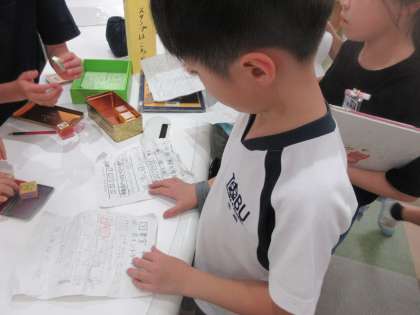 図書委員会が作った「図書室ポイントカード」を持って、図書室を利用している子供たち。スタンプが貯まると「プラス1冊貸出券」やしおり等のプレゼントがもらえます。