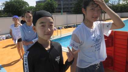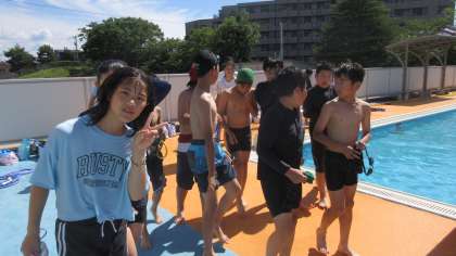 よい天気の中、プールに入ることができました。まずは、プールでの学習の際の安全についての説明を聞き、ルールを守って学習することの大切さを理解しました。