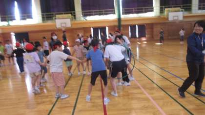 今日の朝は、異学年の児童同士の交流を目的とした「なかよし色団活動」の日でした。赤団の6年生が「フラフープくぐり」を計画し、進行も行いました。全校児童の赤団のメンバーを7つのグループに分け、それぞれのグループがフープをくぐる秒数を競い合いました。