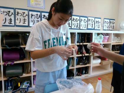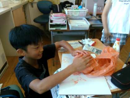図工の「固まった形から」の学習で、布に液体ねんどを染みこませることで、好きな形に固める活動を行いました。布をつるしたり、折り曲げたりしながら、進んで自分のイメージを形に表そうとする姿が見られました。
